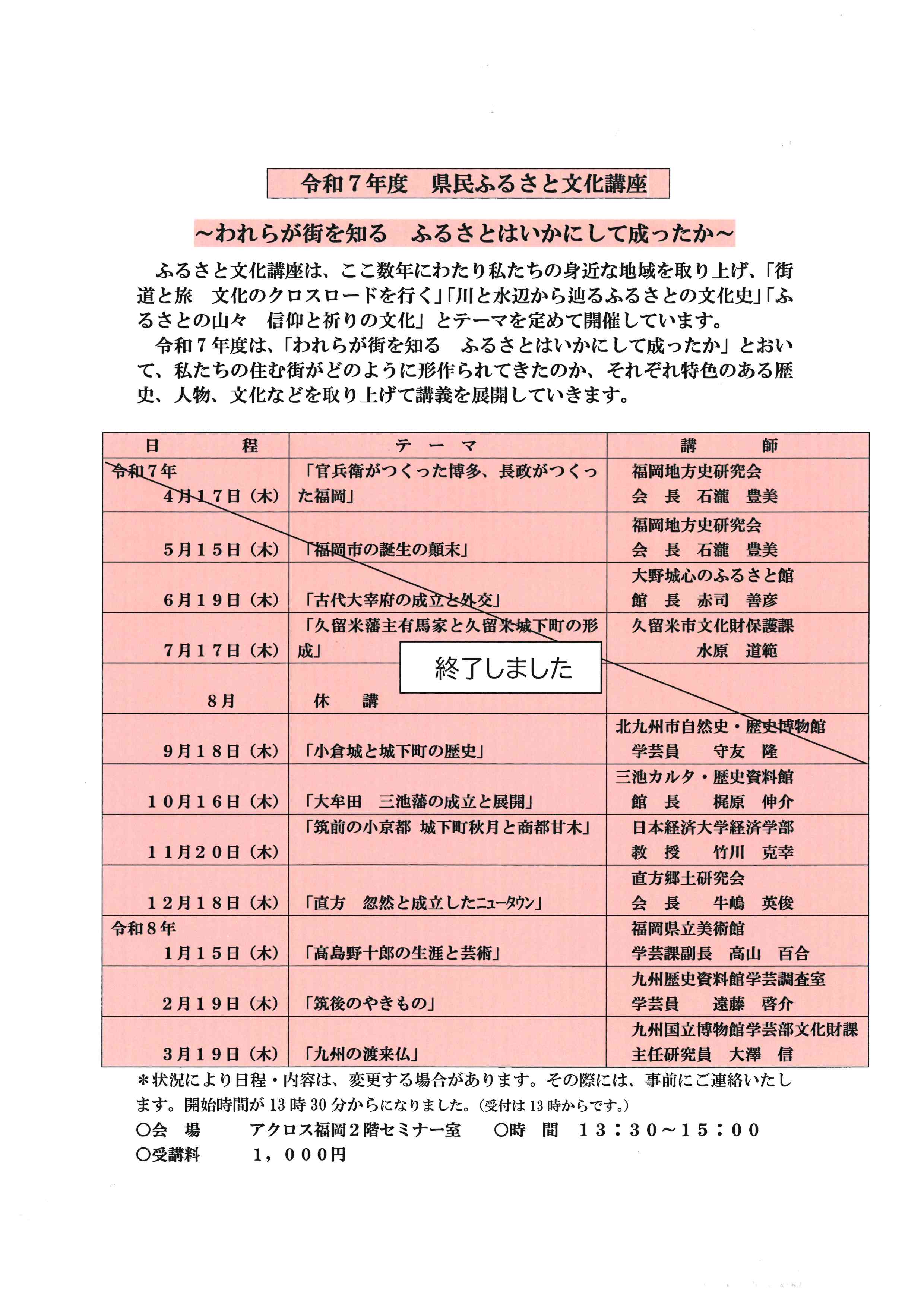 令和7年度の県民ふるさと文化講座は、4月17日(木)開講、毎月第3木曜日、年間11回シリーズで開催いたします。4月より受講お待ちしております。今回より開始時間は、13:30(受付13時より)からになりました。