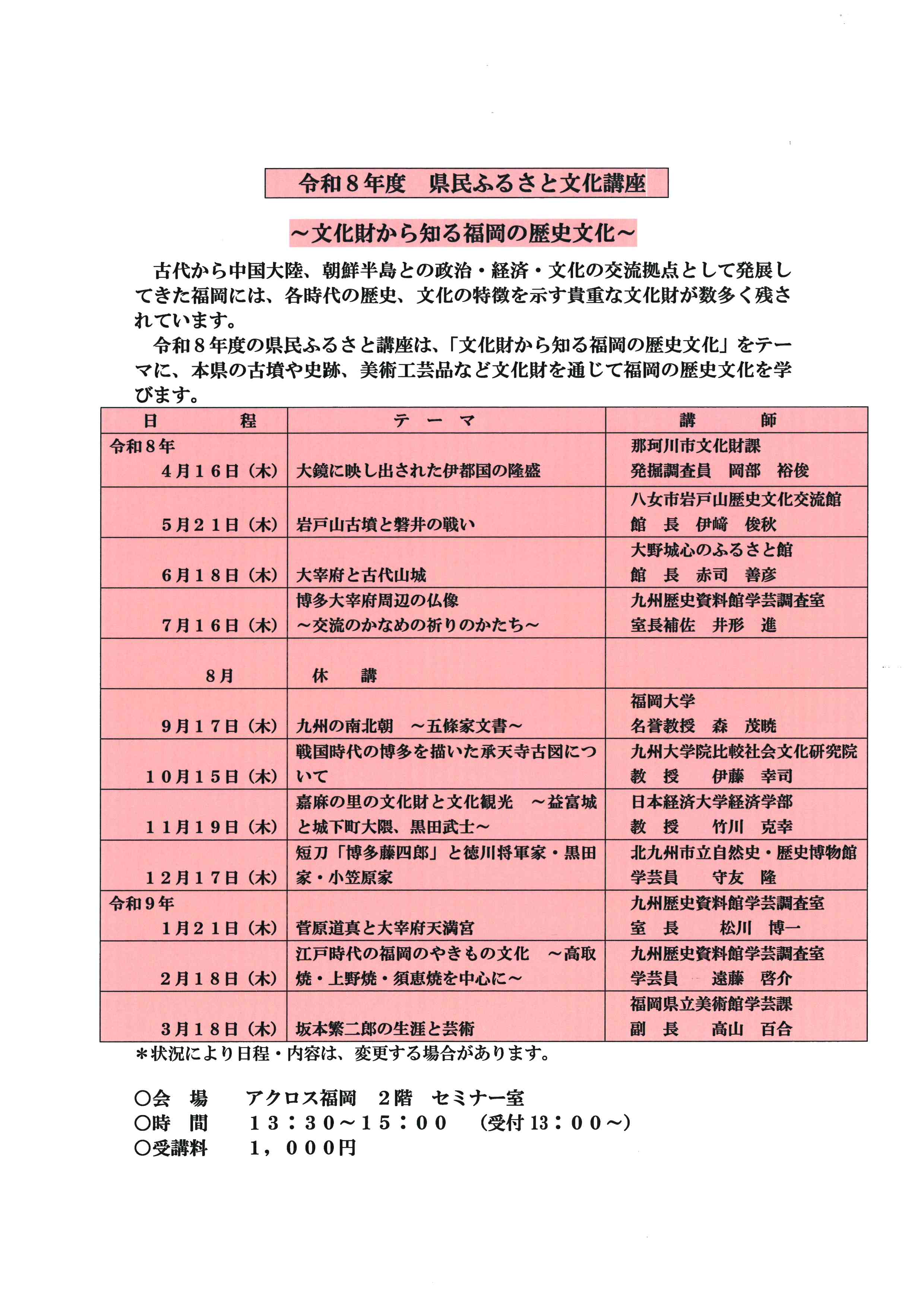 令和8年度の県民ふるさと講座は、「文化財から知る福岡の歴史文化」をテーマに、本県の古墳や史跡、美術工芸品など文化財を通じて福岡の歴史文化を学びます。