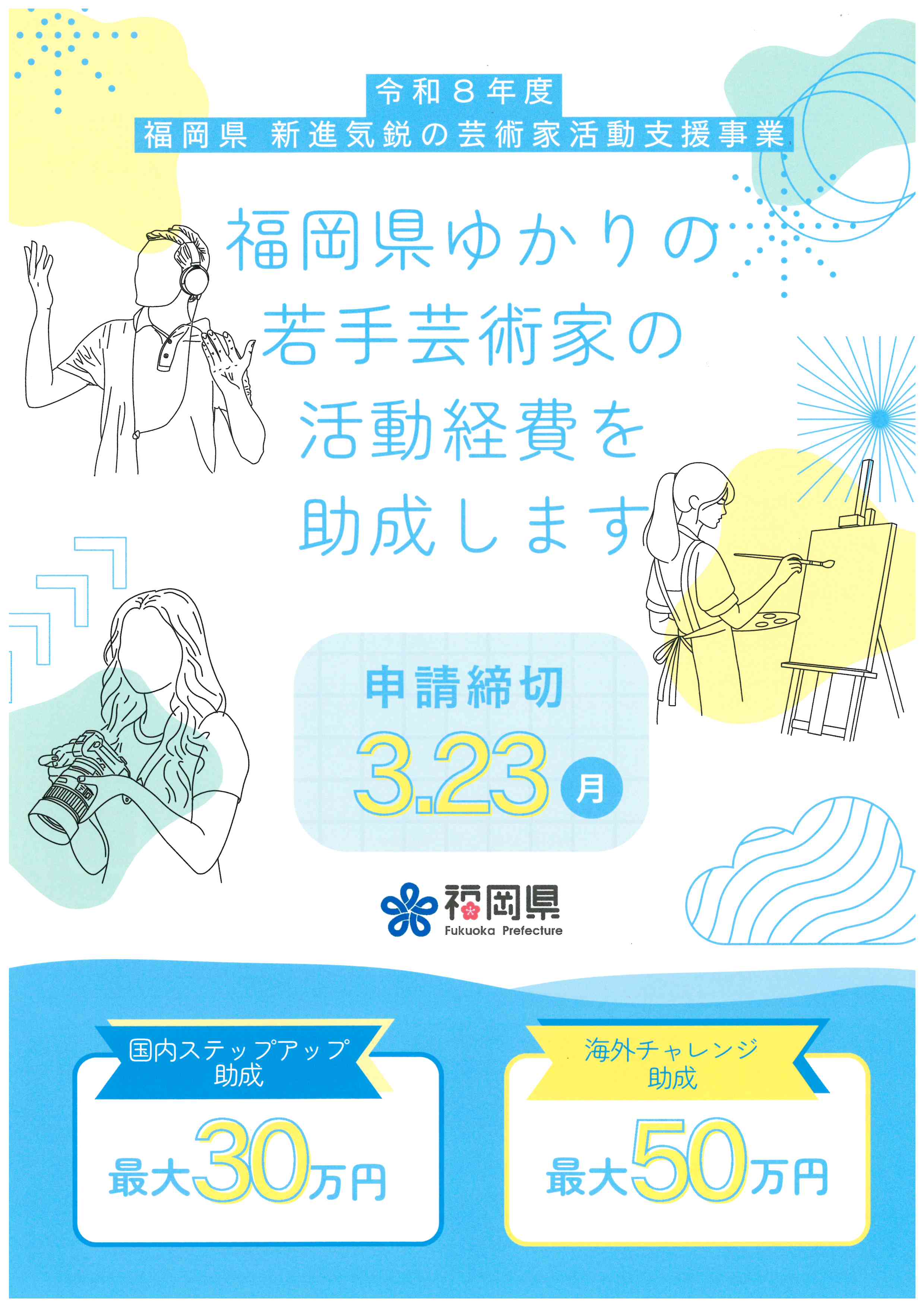 福岡県では、令和8年度 福岡県 新進気鋭の芸術活動支援事業として福岡県ゆかりの若手芸術家の活動経費を助成します。